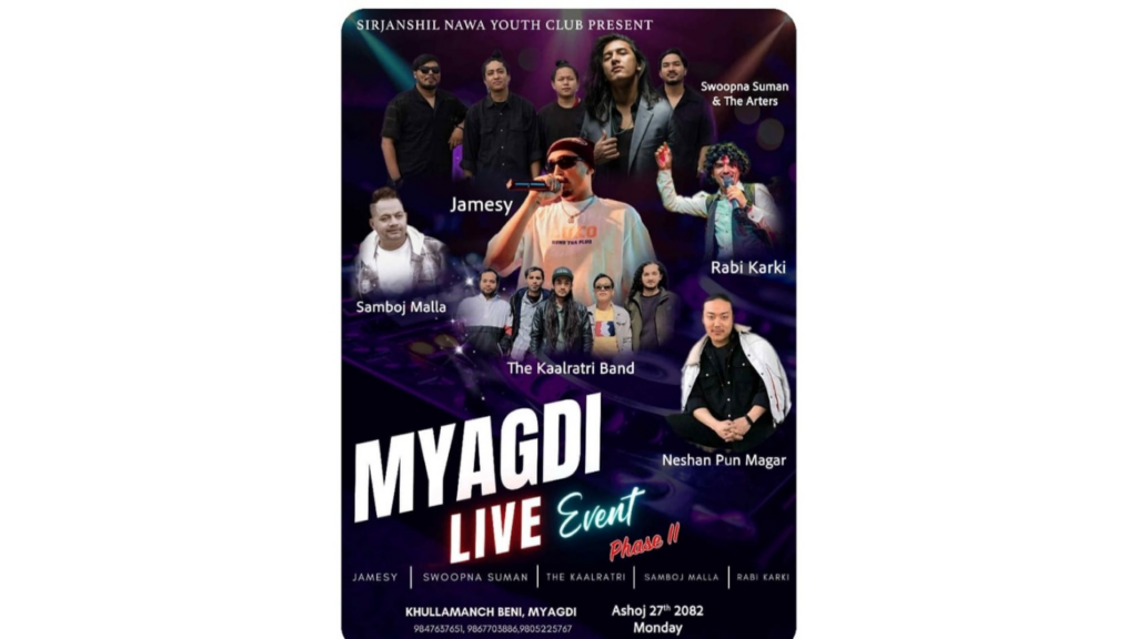 बेनी (म्याग्दी)। सिर्जनशील नवा युथ क्लबको आयोजनामा म्याग्दीको सदरमुकाम बेनीस्थित खुलामञ्चमा आगामी आशोज २७ गते, सोमबार “म्याग्दी लाइभ इभेन्ट–फेज II” हुने भएको छ।
