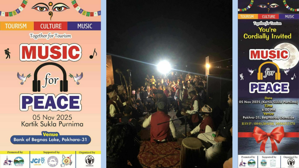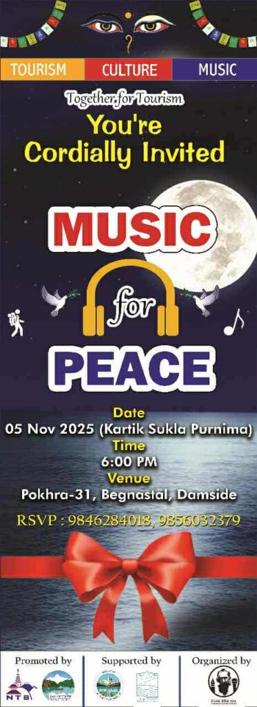 शान्तिका लागि संगीत’ नाराका साथ पोखराको बेगनास तालमा कार्तिक शुक्ल पूर्णिमाको अवसर पारेर विविध सांस्कृतिक तथा लोकसंगीत कार्यक्रम भव्य रूपमा सम्पन्न भएको छ।